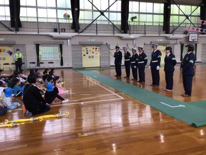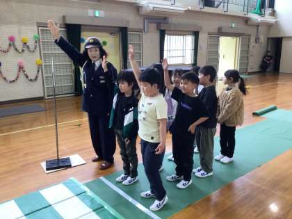 たくさんの交通安全指導員さんに来校いただき、安全に登下校するために大切なことを教えていただきました。大畑子ども園の年長さんも一緒に学びました。よく信号機を見ること、車の確認の仕方、踏切では音もきくようにする、安全な傘の持ち方など、教えていただいた後は、実際に体育館に設置された信号機や横断歩道のある道を歩きました。どの子も、交通安全を意識してルールをしっかり守ることができました。