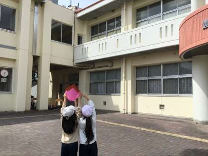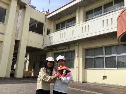 3年生の大畑っ子が昼放課、学校マスコットキャラクター「ばたっぴぃ」にコシアカツバメの巣を教えてくれていました。