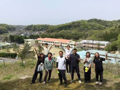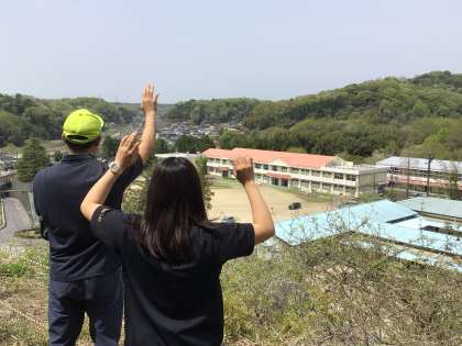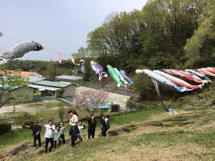職員で、やっほうやまに登りました。大畑こども園の奥で、風の中を泳ぐこいのぼりをくぐり、登っていきました。道々には、西洋たんぽぽやすみれ、藤の花などが咲いており、季節の移り変わりを感じました。頂上から見える大畑小学校に向かって「ヤッホー」と叫ぶと、職員室前で大きく手を振る別の職員の姿が見えました。