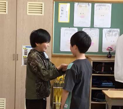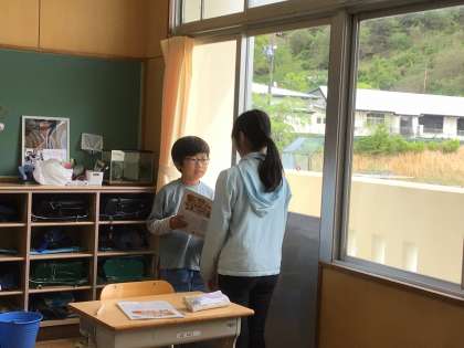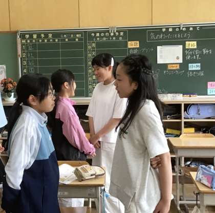 外国語科の授業の始めに英語を使って挨拶をし合いました。How are you? I am fine.などとアイコンタクト、リアクション等に気をつけながら、会話をしました。終わった後は、「自分と同じ答えの人がたくさんいた」などと言って、嬉しそうにしている子がたくさんいました。