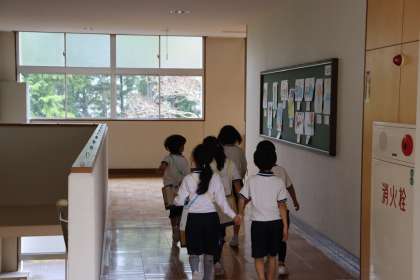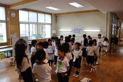 2年生が先輩として、1年生を連れて大畑小学校の中を案内しました。各特別教室の前にあるクイズに、みんなで取り組みキーワードを集めていきました。集めたキーワードを並び替えると、「ようこそおおばたへ」というメッセージになり、そのメッセージを見て1年生も喜んでいました。探検の最後には、プレゼントを渡し合いました。