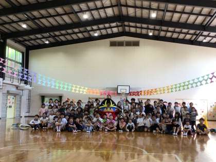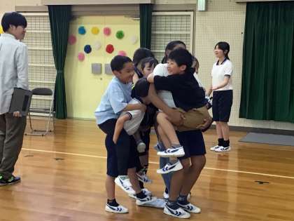 なかよし班出会いの会を行いました。お馴染みの「ばたっぴぃズ」が登場し、なかよし班(縦割り班)に分かれて、大畑っ子みんなで楽しく自己紹介をしたり、新聞じゃんけんをしたりしました。それから、じゃんけん汽車ポッポをして遊びました。最後には、大畑っ子たちの楽しそうな声を聞きつけた大畑小学校マスコットキャラクター「ばたっぴぃ」が体育館に駆けつけ、集合写真を撮りました。思い出深い会になりました。