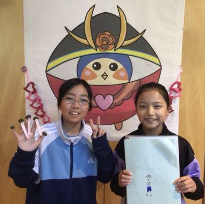 ばたっぴぃグッズを作成し、校長室に見せに来てくれた4年生と6年生。