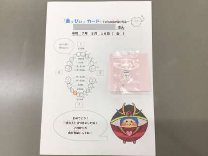 大畑小学校では、乳歯が抜けたときに、一歩大人に近づいたお祝いとして、「歯っぴぃカード」をプレゼントしています。