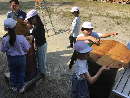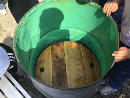 水を入れたら、中に木の板を入れます。 後は温めたらドラム缶風呂の完成です。
