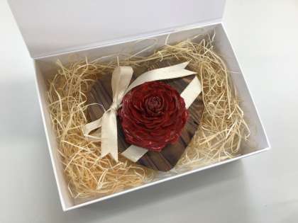 ハート形の木の板に、赤く塗られた大きなシダーローズが飾られています。
