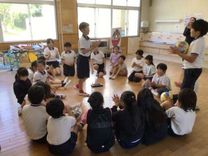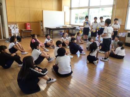 今年度初めてのなかよし班(縦割り班)あそびを行いました。赤チームは、6年生が考えた「ばたっぴぃ(学校マスコットキャラクター)大当たりゲーム」をしました。円になって、ばたっぴぃがついたボールを音楽に合わせて渡していくゲームです。ばたっぴぃ大当たりになった子は、6年生からインタビューを受けていました。みんな笑顔いっぱいで、楽しい時間となりました。
