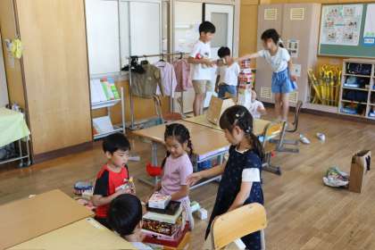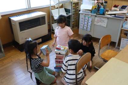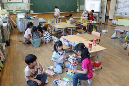 算数科で、いろいろな箱を積んで動物や車、建物などを作りました。グループが同じ子と何を作るか話し合ってから、試行錯誤しながら笑顔で活動する子ども達の姿が見られました。今後は、それぞれの形に着目してなかま分けをしたり、形を紙に写してそこから絵を描いたりする活動を通して、図形を学んでいきます。