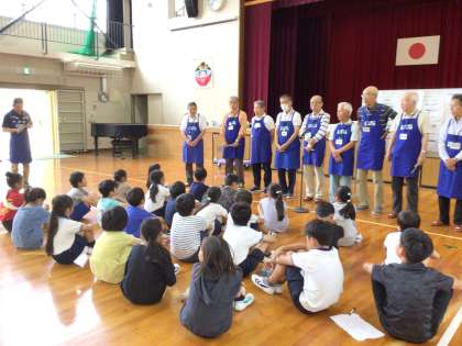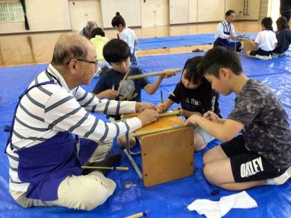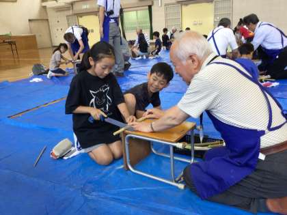 ものづくりサポーターの方々から、空気てっぽうの作り方を教えていただきました。ノコギリや金づちを使って、竹から全て作りました。どの子もサポーターの方々の話を真剣に聞いていました。