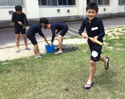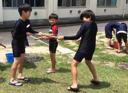 自分たちで作成した水てっぽうを使って、遊びました。