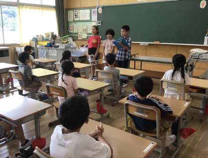 以前、豊田市役所環境政策課の方から教えていただいた脱−1グランプリに、他の学年も一緒に協力してもらおうと呼びかけに行きました。グループで台詞を考えたり、発表の練習をしたりしました。また、「はっきりと声を出そう」「目線も合わせた方がいいね」などとめあても決めました。他の学年の子達も真剣に聞いてくれました。環境をよくするために、大畑っ子みんなで挑戦します!