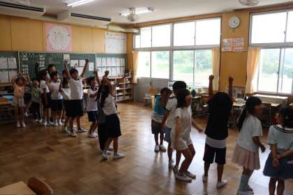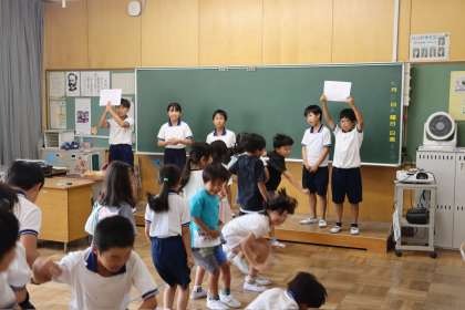 今年度2回目のなかよし班(縦割り班)あそびを行いました。白チームは、「○×ゲーム」をしました。1から5年生は1列になり、6年生が出題した問題の答えを予想して、正解だと思う方にジャンプして問題に答えました。学校や大好きな6年生にかんする内容が出題されて、正解はどっちだろうと真剣に考える子ども達の姿が見られました。活動を通して、笑顔で交流する様子が見られ、チームの仲をより深められました。