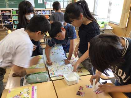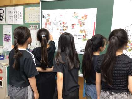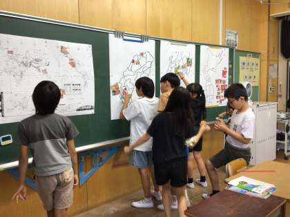 スーパーマーケットのちらしを切り取り、地図に貼って、どこからどんな農産物がや水産物が来ているのかを調べました。
