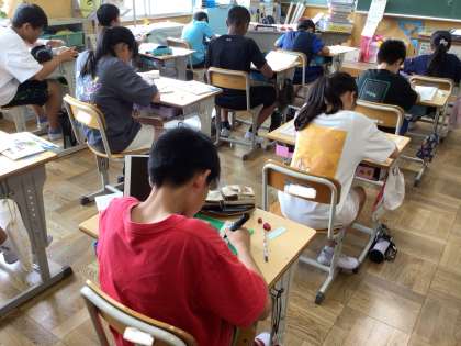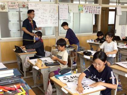 毛筆の作品を挟むための「書写作品集」にタイトルをつけました。自分の好きな色の台紙(色画用紙)を選び、思い思いのタイトルをつけ、鉛筆で下書きをしました。名前や絵を丁寧にかき、最後に4月から書いてきた作品をのり付けしました。夏休み以降も毛筆で作品を綴っていきます。3月に自分がどれだけ成長したのかを見るのがとても楽しみですね。