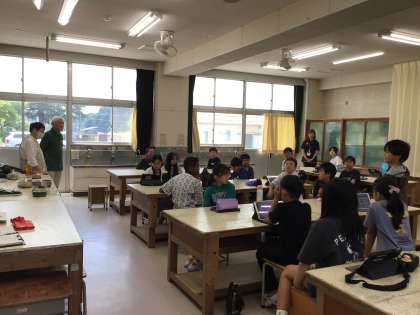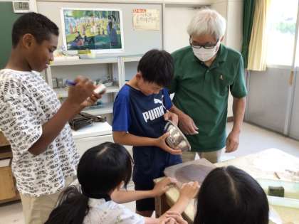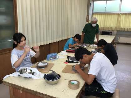 事前に書道半紙に描いてあった「ばたっぴぃ」を丁寧になぞり、お皿に描き写しました。線がずれないように、集中して、取り組みました。講師の先生が、6年生の子ども達に寄り添ってきめ細やかな指導をしてくださり、初めてお皿作りをする子達も安心して行うことができました。