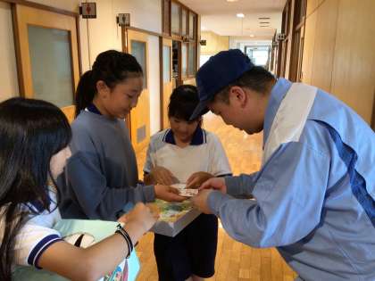 地域の企業の方から、大畑っ子の安心・安全のために「交通安全ドリル」を全校児童数分、いただきました。
