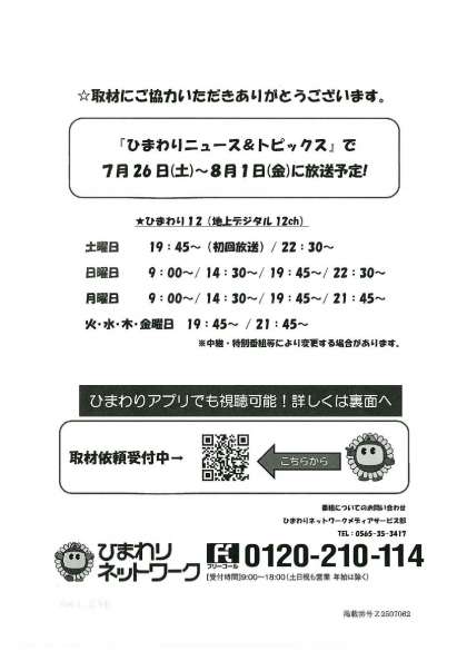7月29日(火)に開催される「交通安全子ども自転車愛知県大会」に向けた練習の様子を、ひまわりネットワークの方が取材に来てくださいました。大畑小学校の取組を広く様々な方に知っていただけることに感謝しています。番組の放送予定は以下のとおりです。ぜひ、ご覧ください。