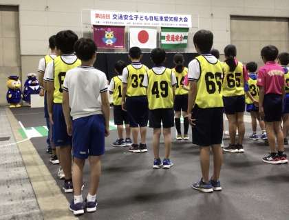 「交通安全子ども自転車愛知県大会」の開会式が行われました。大畑っ子代表としてしっかりと並び、よい姿勢で開会式に臨むことができました。いよいよこのあとに実技試験が始まります。実技試験では、自転車の正しい乗り方と安全な走行を評価する安全走行テスト、8の字走行や遅乗りなど自転車の乗り方の熟練度を評価する技能走行テストの2種類のテストが行われます。交通指導員の方々に教わったことを存分に発揮し、ベストを尽くしてほしいと思います。