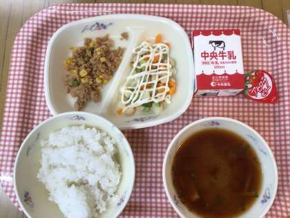 今日の献立は、「ツナそぼろ丼、牛乳、じゃがいもと大豆のサラダ、備蓄用みそ汁、アセロラプチゼリー」でした。