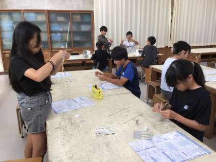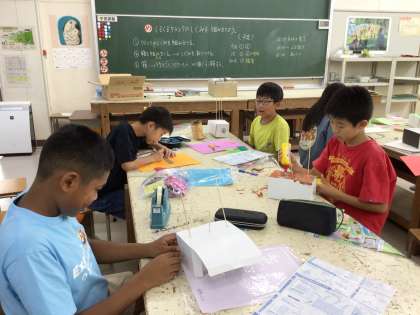「くるくるクランク」の学習に入りました。クランクの仕組みを確認し、どんな順番で作っていくとよいかをみんなで話してから作品づくりに入りました。子ども達は、針金の両端を持って、くるくると回すと竹ひごが動く仕組みを興味深く見ていました。