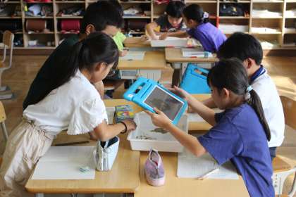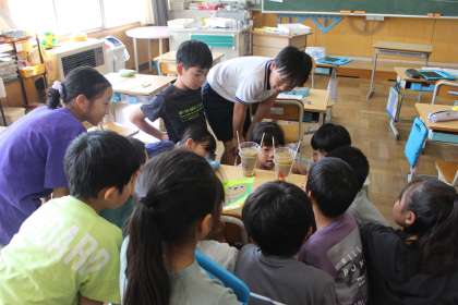 理科の授業で、雨水のゆくえを探っています。今回は、土によって水のしみこみ方がどう変化するか調べました。運動場の土と砂場の土では、こんなにも水のしみこみ方が違うことに驚いていました。実際に実験してみることで、発見できることがあると気付きました。