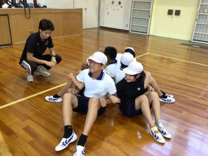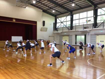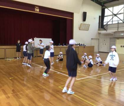 第1部では、準備体操で行っている動きの一つ一つを確認しました。手をたたくタイミングをペアで互いに見合ったり、体のどの部分を伸ばすための運動なのかを考えたりしました。第2部では、なかよし班あそびで使えそうなゲームを教えていただき、実際に体験しました。小さい子達でも楽しめるようにするには、どうしたらよいかを考えたとてもよい学びの時間となりました。