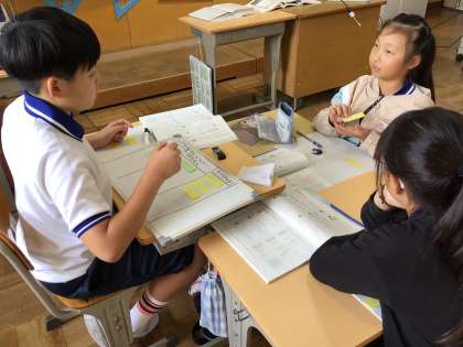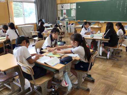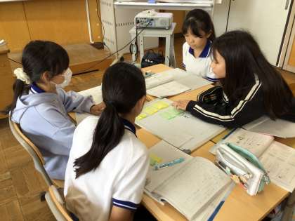 みんなで決めた議題「授業での発言を増やすためにどうしたらよいか」を解決するために、原因と取り組みを考え、各自で付箋に書き出しました。その付箋を使って意見を出し合い、考えを広げ、班で意見をまとめました。