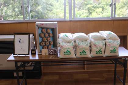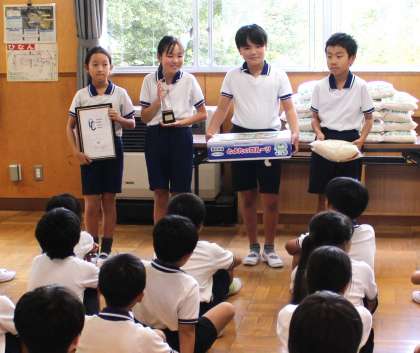 全校児童が集まり、脱-1グランプリの表彰式が行われました。代表児童が「誰でも、できることなので、みんなが前向きに取り組めたらうれしい」と、今後も脱-1を意識した取組の参加を呼びかけていました。大畑っ子は副賞でいただいた、豊田のお米の多さにびっくりしながら、参加者の頑張りを喜んでいました。校長からは、報道発表で優勝を知った地域の方々や大畑小学校にかかわりのあった先生方から、大畑っ子の活躍を知り、お祝いのメッセージが届いたことが伝えられました。
