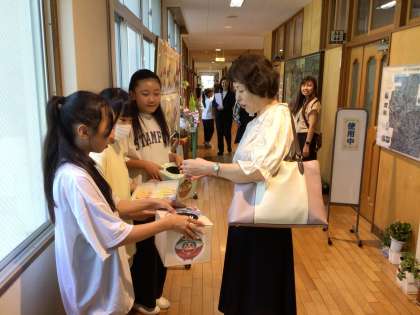 大畑小学校に来てくださったお客様をおもてなししようと、6年生を中心に「おみくじ」と「お守りみくじ」でお出迎えしました。「大畑小学校にようこそいらっしゃいました。ぜひおみくじを引いてください」と6年生が声をかけると、うれしそうにおみくじの箱に手を差し込んでみえました。出迎えた6年生は、やや緊張気味でしたが、お客様が喜ばれるのを見て、ホッとした様子でした。