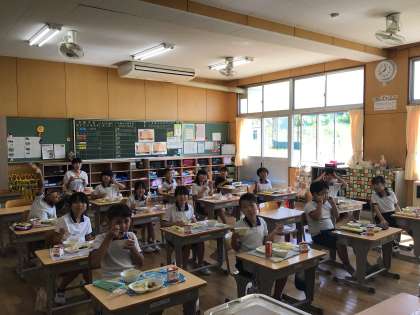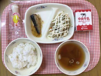 今日の給食は、「ごはん、牛乳、いわしのしょうが煮、ごぼうサラダ、いものこ汁、月見だんご」の「月見献立」でした。