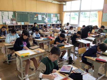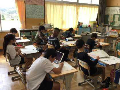 今年度6年生は、『蜘蛛の糸』で読書感想画を描いています。読み聞かせで聞いた内容からイメージを膨らませて下描きをしました。物語の中で心に残ったことを、紙面いっぱい使って大きく描いていました。