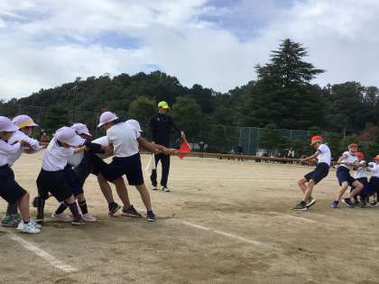 「つ・な・ひ・き」では、全校で綱引きをしました。両チーム共に、練習のときよりも声がそろい、どの子も全力で綱を引くことができました。