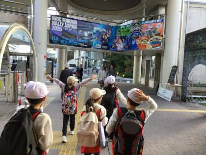 総合的な学習の時間に、「ラリージャパン2025」のイベント会場である豊田スタジアムへ校外学習に行きました。篠原駅から電車に乗って、新豊田駅に着くと、豊田スタジアムに向かう会場までの道のりは、ラリーに関するポスターや広告が貼ってあったり、出場選手の旗が掲示されていたりしていました。さらに、マンホールもラリーカーのデザインになっていて、豊田市全体で世界的なイベントであるラリージャパンを応援していることが伝わってきました。