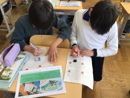 キャッチコピーや文章の内容、使用している絵のよさを見つけ、真剣に仲間にメッセージを書いていました。「この言葉、次は真似させてください」や「文章がとても読みやすくてすてきです」などの言葉をいいねカードにたくさん書いていました。仲間のポスターから新たな学びがありましたね。