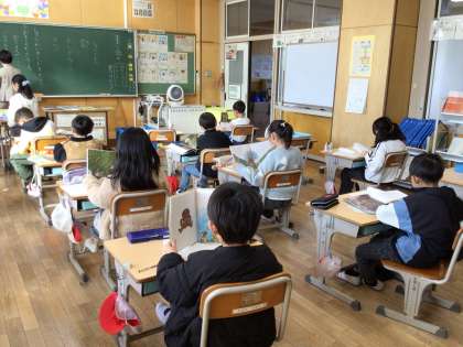 中央図書館からスペシャルな先生をお呼びし、たくさんのことを教えていただきました。2年生は、「3枚のおふだ」の絵本を読み聞かせをしていただいてから、昔話の紹介を仕方を教えてもらいました。これから自分の選んだ昔話を紹介するのが楽しみになりました。