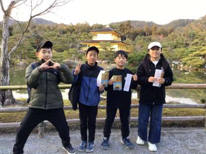 金色に輝く舎利殿、水面に浮かぶ金閣寺を見て、6年生の目もきらきらと輝いています。
