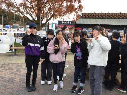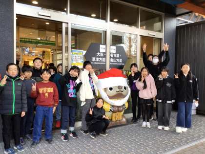 滋賀県ならではのタヌキと一緒にパチリ。白いタヌキやサンタタヌキに季節を感じます。みんなとても嬉しそうです。