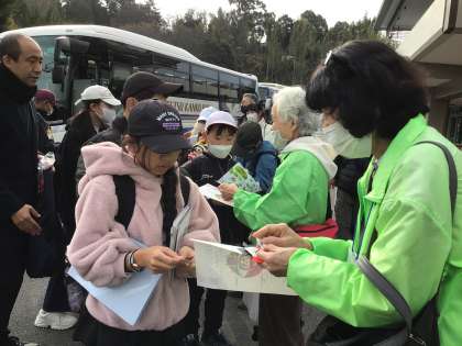 事前学習で調べてきたことを本物を見ながら確認したり、ボランティアガイドさんから教えていただいたことをしおりに書き足したりしました。お礼を述べた後、大畑小学校区マスコットキャラクター「ばたっぴぃ」を紹介し、ちらし、手作りの折り紙をお渡ししました。