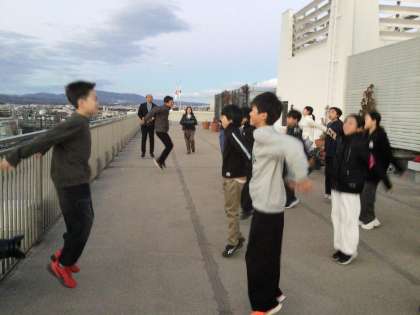 朝、ホテルの屋上に上がらせていただきました。リズムジャンプ体操を行い、体を温めてから見える景色を眺めました。今日訪れる東大寺を見ることもできました。みんな元気に朝を迎えることができました。訪れるのがとても楽しみです。