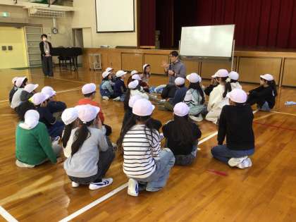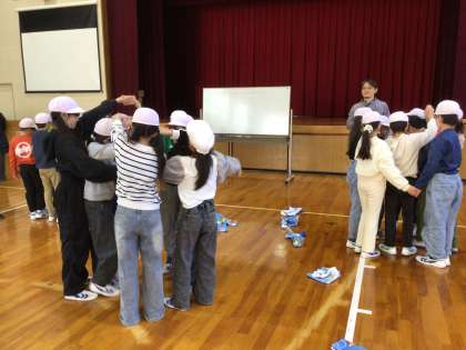 中京大学の先生に来ていただき、縦割り班活動でも行うことができる遊びを教えていただきました。