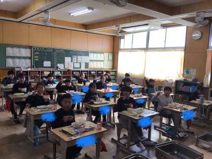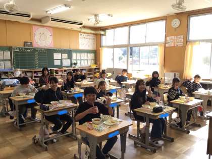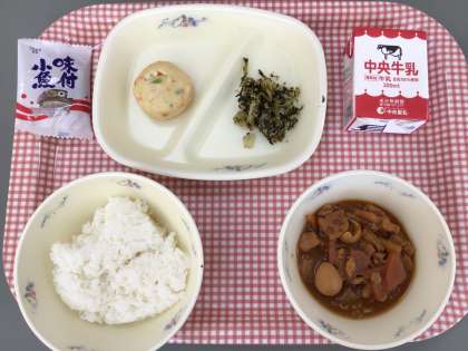 今日の給食は、「七草ごはん、牛乳、根菜のみそ煮、豆腐しんじょ、乾燥小魚」の七草献立でした。