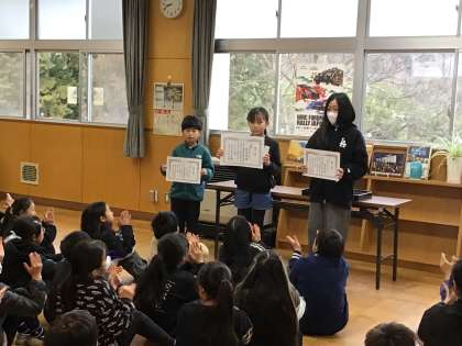 年が明け、子どもたちの笑顔が学校に戻って来ました。2026年最初の全校集会を行いました。校長からは、「丙午」にちなんで馬と人とのつながりや、前向きに努力することで新しい挑戦や前進に適した年であること、より力強くパワフルに活動できるとよいこと、大畑っ子も、ぜひ自分の意志で進んでいってほしい。皆さんにとって、よいことが起こる一年になるように応援している、という話がありました。続いて、科学研究作品展、図書館を使った調べる・伝える学習コンクール、インスタントラーメン小学生レシピコンクールで優秀な成績を残した大畑っ子の表彰を行いました。全校集会での落ち着いた大畑っ子の様子からも、成長を感じました。