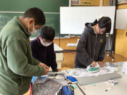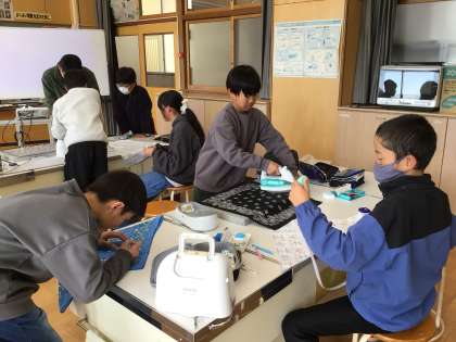 「思いを形にして生活を豊かに」で、バンダナを使って自分だけの巾着袋を作り始めました。まち針の打ち方、しるしの付け方、しつけの仕方などを思い出し、確認して製作を始めました。安全に進められるように、お互いに声をかけ合いながら活動しました。出来上がりが楽しみです。