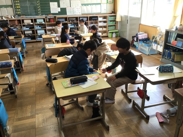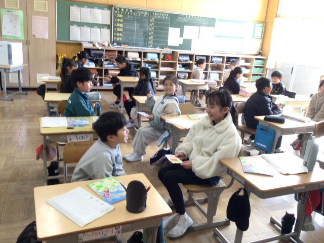 3年生の外国語活動では、グリーティングカードを送り合いました。「This is for you」の言葉に親しみながら活動に取り組む姿が見られました。