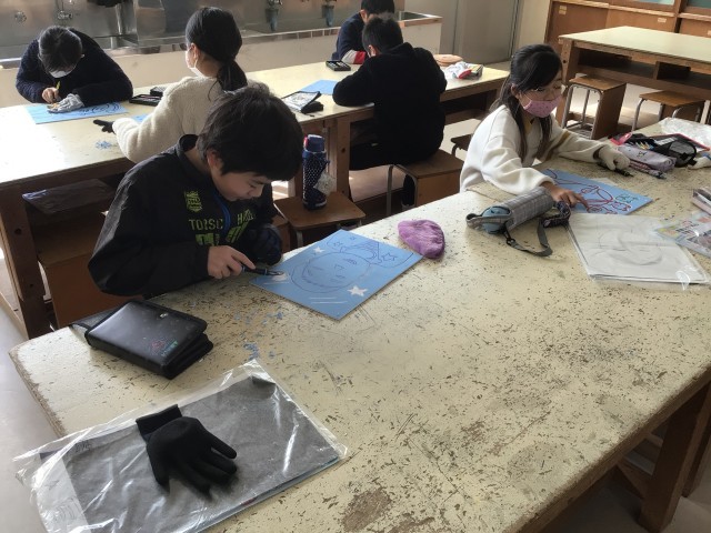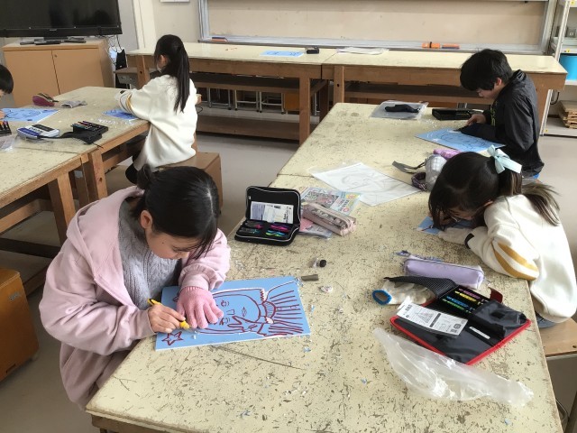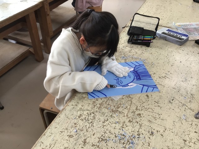 4年生 図画工作科 版画 公開日 2026/02/18 更新日 2026/02/18 各学年から 「ほって すって 見つけて」の学習では、初めて彫刻刀を使って版画を作成しています。丁寧に描いた下絵の線や黒く塗ったところを掘らないように気をつけて掘り進めています。彫刻刀の使い方にも慣れてきました。刷るとどんな風に絵が現れるのか、みんな楽しみにしながら、完成を目指しています。