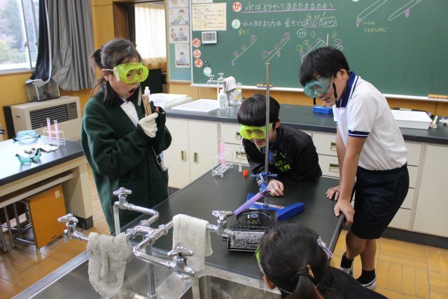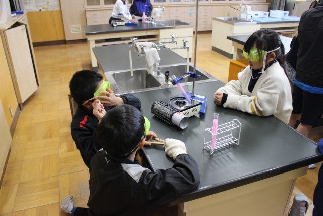 安全のため「ほごめがね」をつけての実験です。水のあたたまり方について、サーモインクを使って調べました。「金属と同じあたたまり方をする」という予想をしている人が多かったですが、結果は少し違いました。「あたためられた水は上の方に行き、その後全体があたたまる」ということが分かりました。
