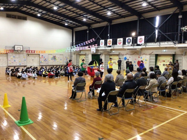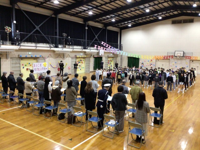 後半では、感謝の気持ちを込めた、感謝状やお手紙、缶バッジをプレゼントしました。来賓の方々と一緒に「ふるさと」を合唱し、体育館中に美しいハーモニーが響き渡りました。最後には、「ばたっぴぃ」と共にみんなでお礼の言葉を伝えました。