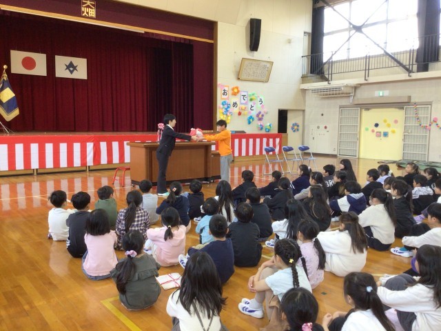 6年生が卒業プロジェクトで制作した雑巾を大畑っ子に贈呈しました。6年生の想いを担任が代わりに伝え、5年生代表児童に手渡しました。これまで代々受け継がれてきたなかよし班での掃除で、来年度使ってもらえると嬉しいです。