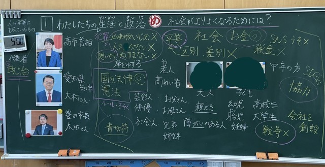 6年生 社会科 社会って何? 公開日 2026/04/14 更新日 2026/04/14 各学年から 6年生は、社会科の学習が始まりました。多様な人々が共に暮らすことを「社会」といい、その社会をよりよくするために国や県、市の代表者が取組を行っていくことを「政治」ということを確認しました。今後は、憲法とは何かや政治はどんなことをしているのかなどを学んでいきます。 +2