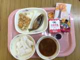 今日の献立は、「ごはん、牛乳、あゆの一夜干し揚げ、とよたチャンプルー、とよたのみ...